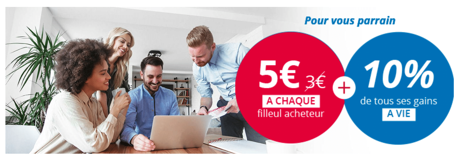 Programme de parrainage : vous pouvez gagner 2€ par filleul validé, ainsi que 10 % des gains de votre filleul pendant 1 an. Le filleul touche quant à lui 1€ à l’inscription.
